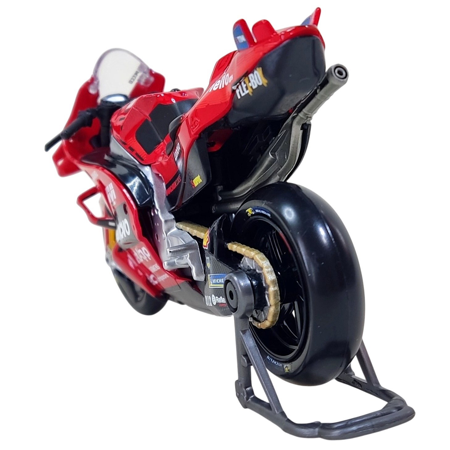 ペッコはGP24を駆り、2年連続となるMotoGPタイトル獲得に挑み、同じドゥカティGP24を走らせるホルヘ・マルティンとともに数多くの激闘を繰り広げました。特にシーズン終盤のバルセロナGPでは、スプリント・決勝ともに驚異的なパフォーマンスを披露し、最後は惜しくもタイトルを失うことにはなったものの、その闘志溢れる走りはファンの歓声を浴びました。チャンピオンとしての重圧と、ライバル勢との熱いバトルを経て「ただ勝つだけでなく、進化し続けることの大切さ」を証明したペッコの物語も、このミニチュアに込められています。