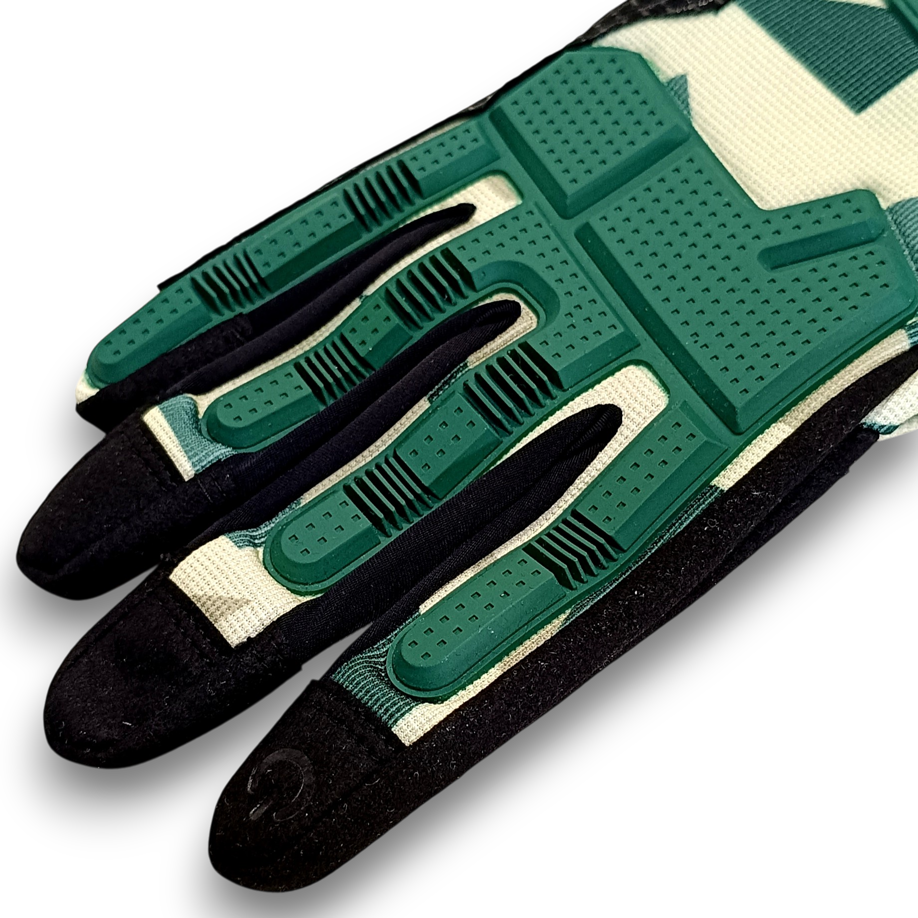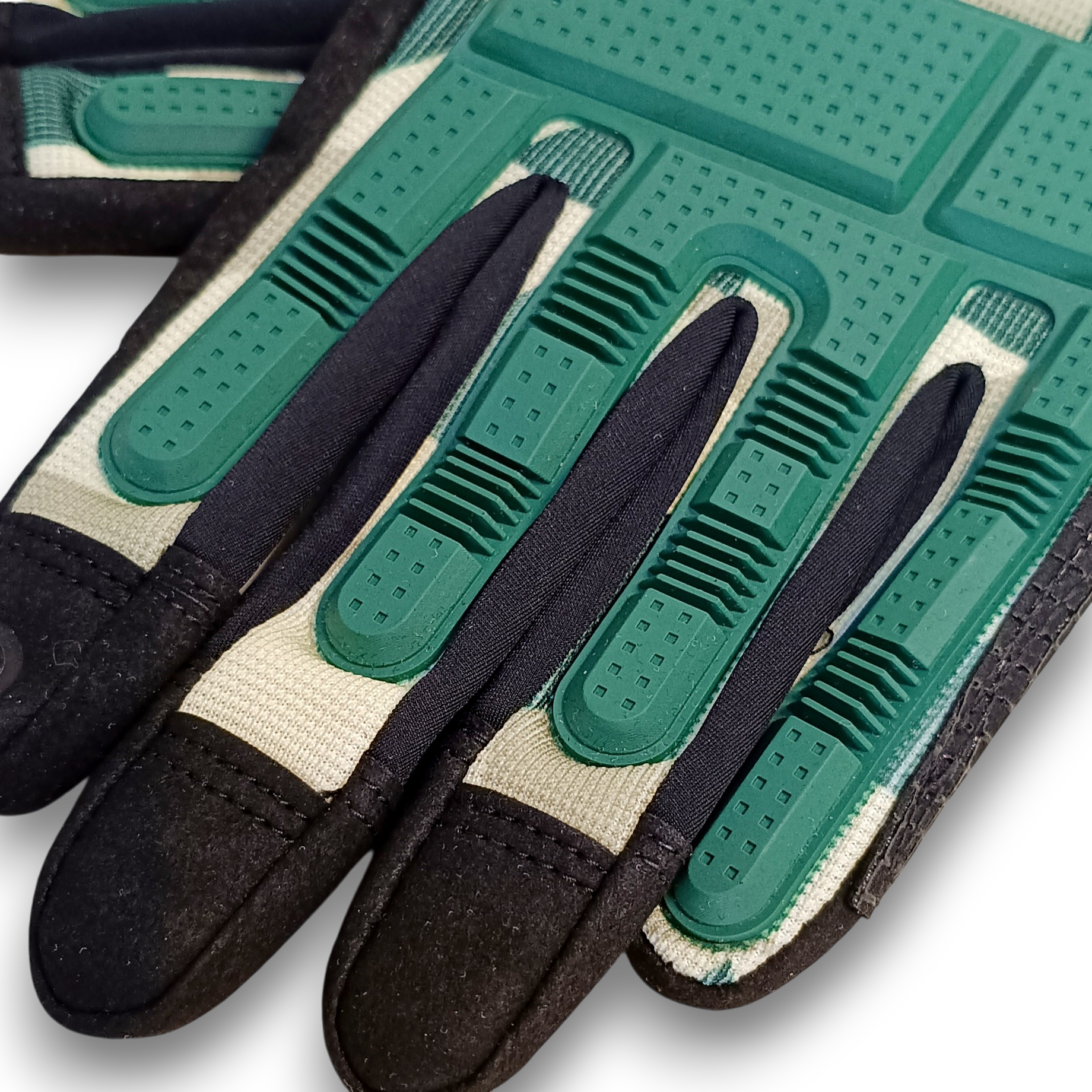 指先と手の甲にはラバープロテクションが広い面積をカバー。手のひら側は厚手クッションが入り、ブレーキング時の負荷や振動、枝や小石のヒットからしっかりガードしつつ、操作性も損ないません。