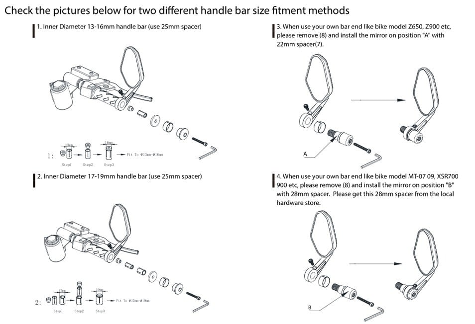商品構成:ミラー×2、バーエンド×2、ミニレンチ(作業用サービス品)、サイズ変換用インサートアダプター、インストラクションカード(英語)