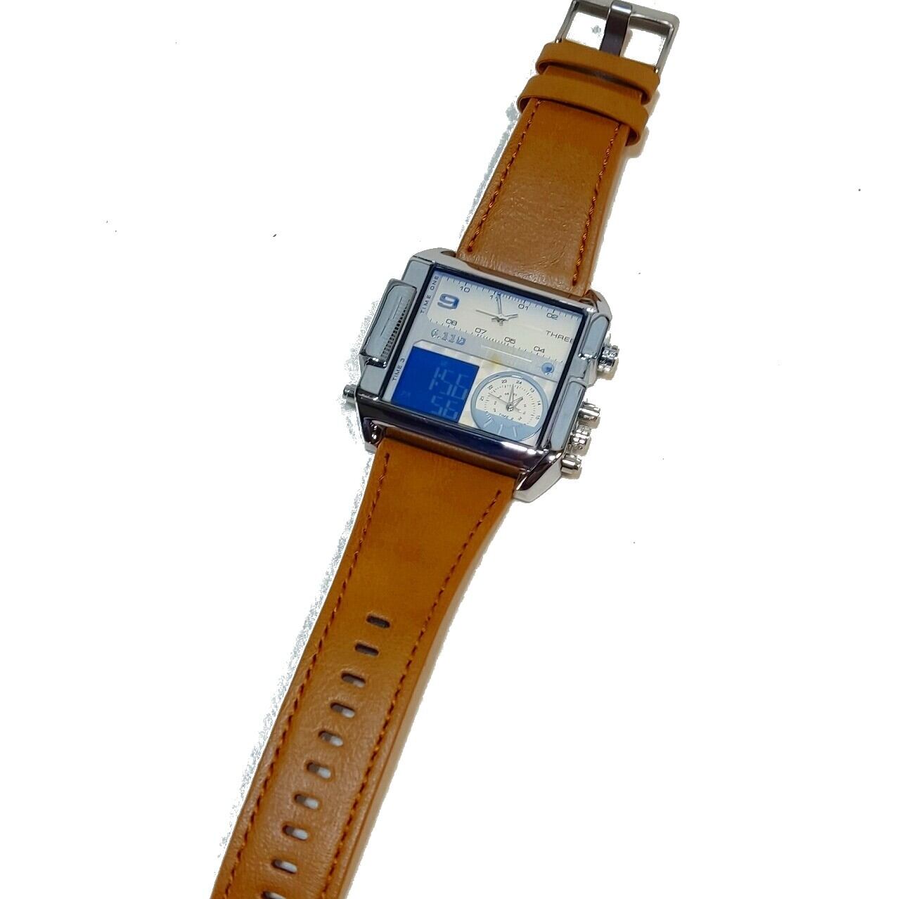 アナログ2面、デジタル1面の時計をひとつに凝縮した、人目を惹く強烈なデザインですが、同時にファッショナブルなおしゃれさも兼ね備えたこちらの腕時計。