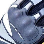 ナックルガードはソフトラバー製。手首には光を反射するリフレクト加工が施されたチップが埋め込まれており、安全性を高めています。
